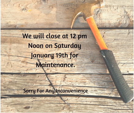 Closing for Maintenance Posted by Brenda 0 Share this: Click to share on X (Opens in new window) X Click to share on Facebook (Opens in new window) Facebook Like Loading... Related