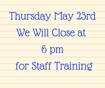 We Will Close at 6 pm on Thursday May 23rd for Staff Training.